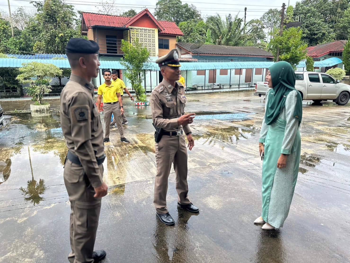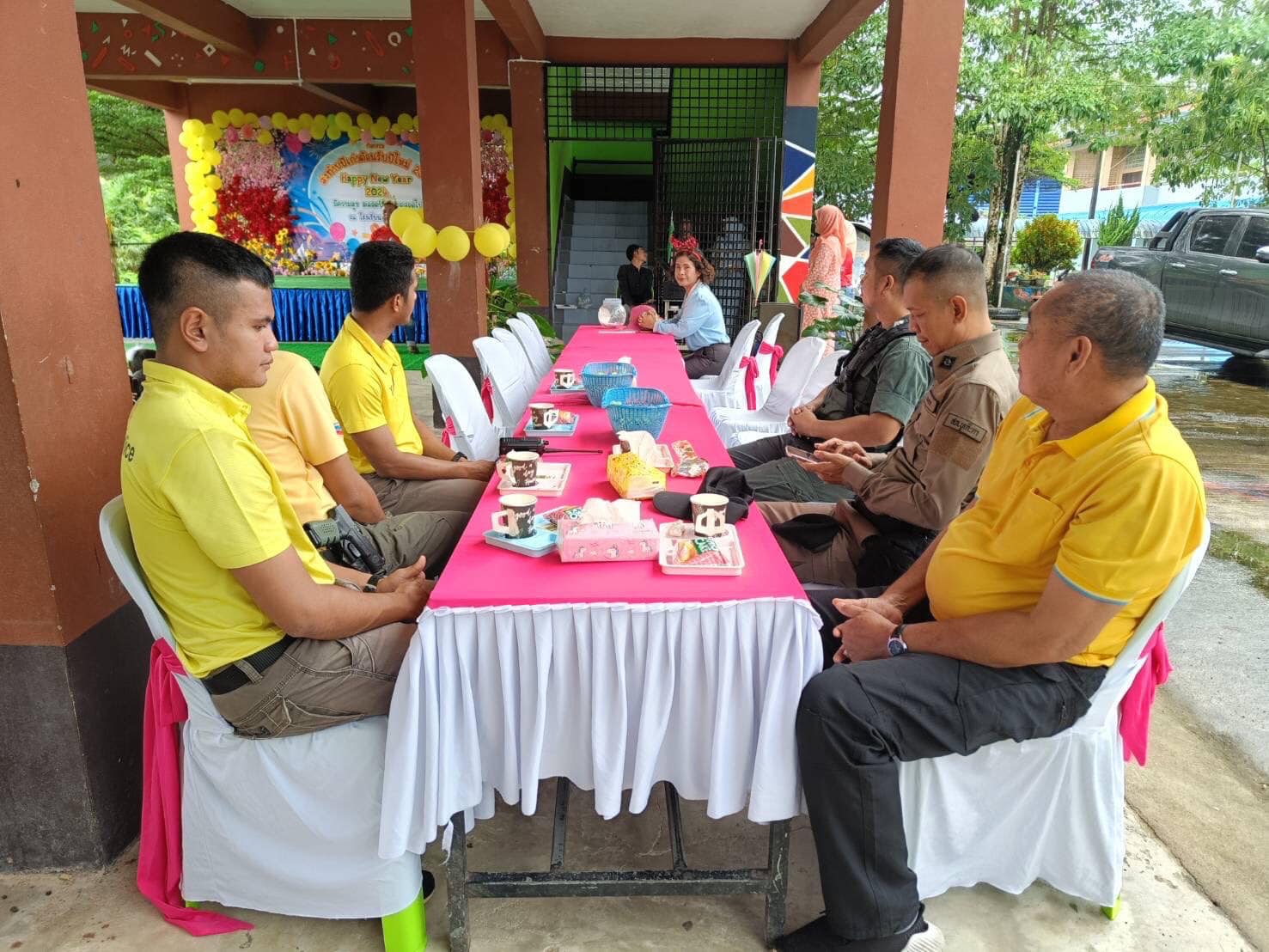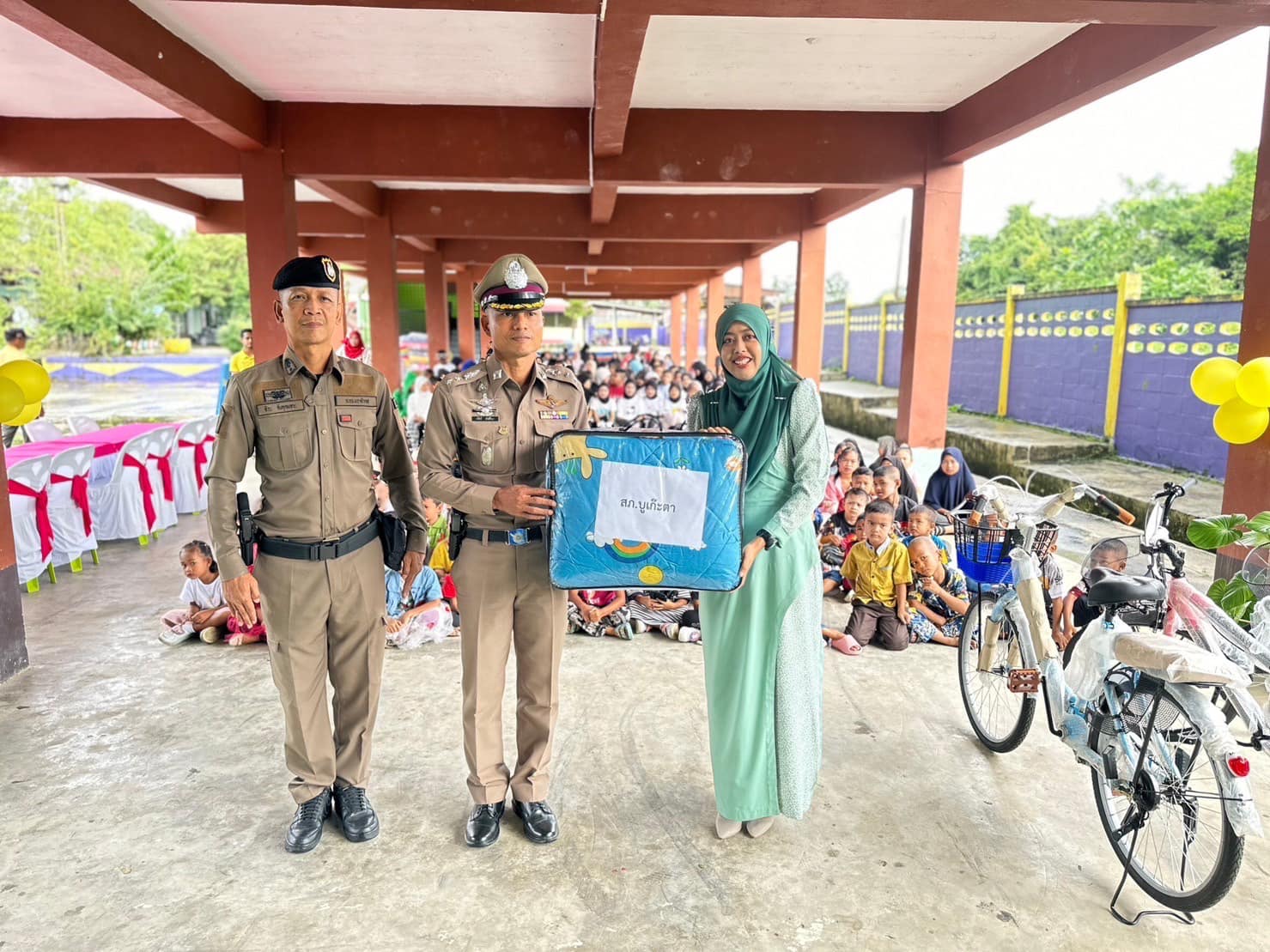 ว่าที่ พ.ต.อ.ทวีศักดิ์ สวัสดิ์รักษา ผกก.สภ.บูเก๊ะตา พร้อมด้วย พ.ต.ท.ซีระ อับดุลเลาะ สวป.สภ.บูเก๊ะตา ร่วมกับชุด ชมส.สภ.บูเก๊ะตา ร่วมกิจกรรมส่งท้ายปีเก่าต้อนรับปีใหม่ ภายในโรงเรียนบ้านเจ๊ะยอ ได้พบปะพูดคุยกับคณะครู นักเรียน และสนับสนุนของรางวัลไว้ใช้ในงานกิจกรรมให้กับเด็กนักเรียน