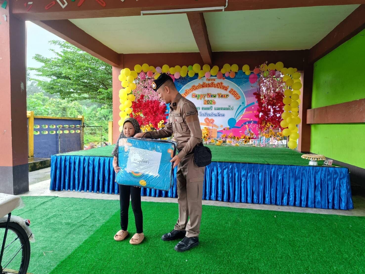 วันที่ 28 ธันวาคม 2566 เวลา 09.00 น.ว่าที่ พ.ต.อ.ทวีศักดิ์ สวัสดิ์รักษา ผกก.สภ.บูเก๊ะตา พร้อมด้วย พ.ต.ท.ซีระ อับดุลเลาะ สวป.สภ.บูเก๊ะตา ร่วมกับชุด ชมส.สภ.บูเก๊ะตา ร่วมกิจกรรมส่งท้ายปีเก่าต้อนรับปีใหม่ ภายในโรงเรียนบ้านเจ๊ะยอ ได้พบปะพูดคุยกับคณะครู นักเรียน และสนับสนุนของรางวัลไว้ใช้ในงานกิจกรรมให้กับเด็กนักเรียน