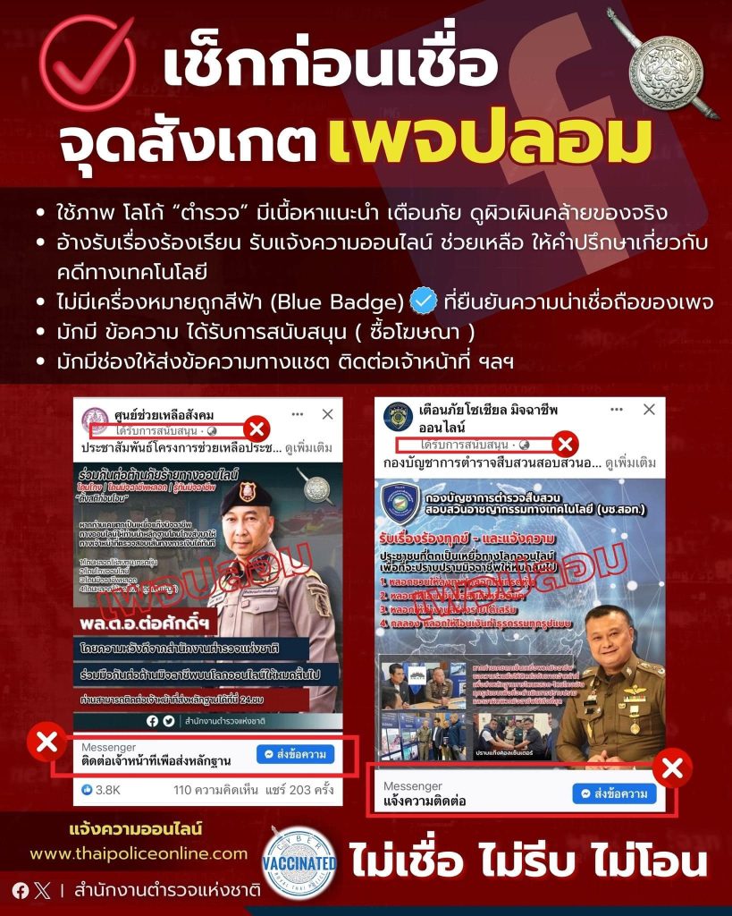 ขณะนี้พบว่ามีมิจฉาชีพสร้างเพจเฟซบุ๊กปลอมจำนวนมาก โดยใช้ภาพ และโลโก้ของตำรวจ มีเนื้อหาให้ความรู้ เตือนภัย คล้ายของจริง อ้างรับแจ้งความออนไลน์ ช่วยเหลือคดี ที่แท้มิจฉาชีพหลอกให้ทักแชต สนทนาส่งลิงก์อันตรายดูดเงิน หลอกพูดคุยลวงให้โอนเงิน ฯลฯ